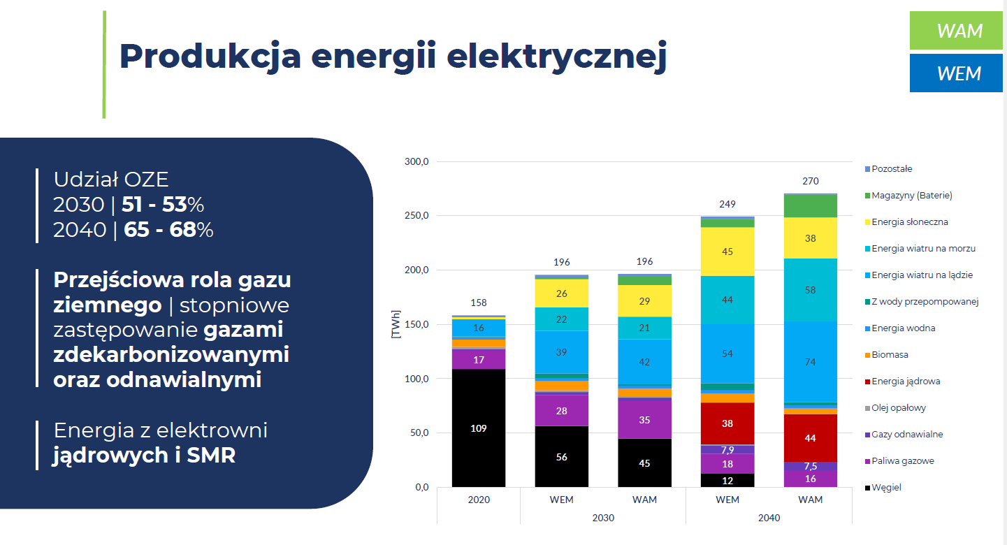 W projekcie ME zakłada „skok cywilizacyjny” przez elektryfikację gospodarki, co ma podbić zapotrzebowanie na energię elektryczną do ok. 200 TWh w 2030 r. i 270 TWh w 2040 r. W prezentacji ministerstwa można prześledzić też wartości porównawcze: 196 TWh w 2030 r. (WEM i WAM) oraz 249–270 TWh w 2040 r. (WEM/WAM).