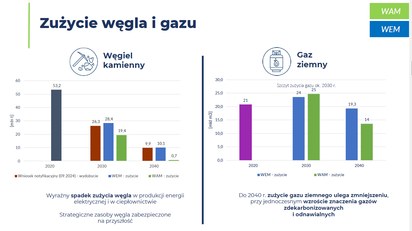 ME opisuje gaz jako paliwo pomostowe. W prezentacji ME pokazyje, że szczyt zużycia gazu nastąpi ok. 2030 r.: ok. 24 mld m³ (WEM) i 25 mld m³ (WAM), a potem czeka nas spadek do 19,3 mld m³ (WEM) i 14 mld m³ (WAM) w 2040 r. Węgiel w scenariuszach ME "wyraźnie maleje": zużycie węgla kamiennego spada z 53,2 mln t (2020) do 28,4 mln t (WEM) / 19,4 mln t (WAM) w 2030 r., a w 2040 r. do 10,1 mln t (WEM) / 0,7 mln t (WAM).