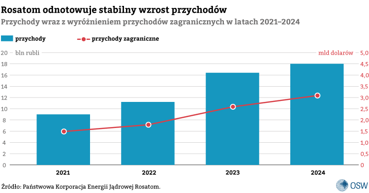 W przeciwieństwie do sektora gazowego czy naftowego Rosatom nie odnotował gwałtownego spadku przychodów po wybuchu wojny. Wręcz przeciwnie – w latach 2022–2024 spółka zwiększyła zarówno łączne wpływy, jak i przychody z zagranicy. Kluczowe znaczenie miały kontrakty na budowę reaktorów jądrowych oraz długoterminowe umowy obejmujące dostawy paliwa i obsługę techniczną.
